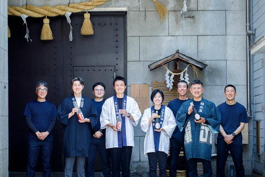 「谷泉×加賀鳶」と6月25日に発売した共同醸造・純米大吟醸「鶴と福」を手にする両蔵元、両杜氏、福光屋の蔵人。前列左から、福光屋専務取締役・福光太一郎、鶴野晋太郎氏、鶴野薫子杜氏、福光屋杜氏・板谷和彦。後列は福光屋の醸造蔵・壽蔵の三役(頭、代司、?屋)と醪担当。共同醸造した壽蔵前にて