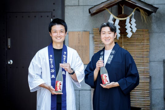 共同醸造・開発した「谷泉×加賀鳶」を手にする鶴野酒造店蔵元・鶴野晋太郎氏(左)と福光屋専務取締役・福光太一郎(右)