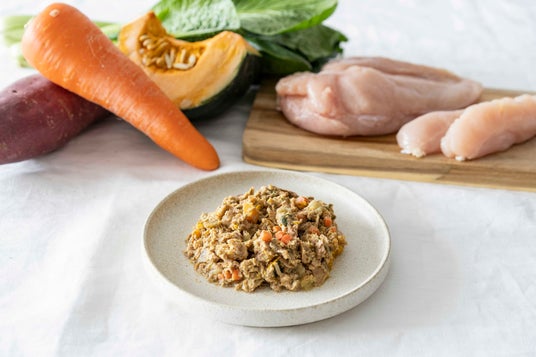 ドライ加工・レトルト加工をしていない冷凍タイプのペットフードです。人間が食べられる品質の食材を使って低温加熱で調理されたごはんで、保存料や酸化防止剤を使わず新鮮なお肉や野菜のもつ栄養はもちろん、旨みや風味もしっかり閉じ込められており、水分量も70%以上と豊富に含まれています。