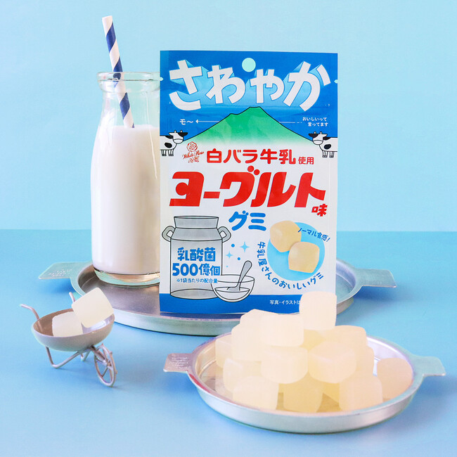 今回は、そんな大人気のブランド牛乳とコラボした【白バラ牛乳使用 ヨーグルト味グミ】を発売いたしました!