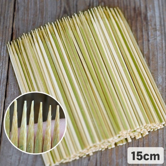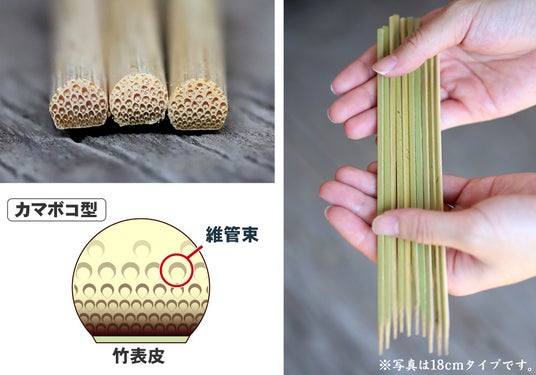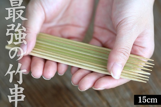 この竹串は国産の竹材料を使用し竹表皮をつけたまま加工しており、その丈夫さは他に類を見ません。竹表皮は繊維が密集しており最も丈夫な部分であるため、高温で焼いても焼け切れにくいという特長があります。防虫剤や防カビ剤は一切使用しておらず、お料理に使用するには最適です。断面はカマボコ型になっており、焼けると身が締まって抜けにくくなるため、焼き鳥などの肉料理におすすめします。