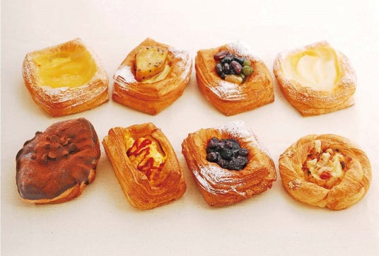 中でも特におすすめの当店の看板商品は、菓子系・惣菜系両方の商品によって展開される“MGMGデニッシュ”シリーズです!バターとパン生地が幾重にも重なり、中はふんわりと外はサクッとした、バター風味豊かな発酵デニッシュ生地が特徴です。見た目にも華やかさをだし、150円でちょっと特別感のあるパンを堪能できた……! なんて嬉しさを感じていただければ、我々も嬉しいです。