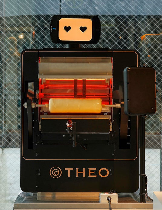 THEOは株式会社ユーハイムが開発したバウムクーヘンAI職人です。職人が焼く生地の焼き具合を各層ごとに画像センサーで解析し、その技術をAIに機械学習させデータ化、無人で職人と同等レベルのバウムクーヘンを焼きあげることができます。ユーハイムの熟練職人のほか、ロボット工学の研究者、AIの専門家、デザイナーなど様々なプロフェッショナルの協力のもと、約5年の開発期間を経て誕生しました。