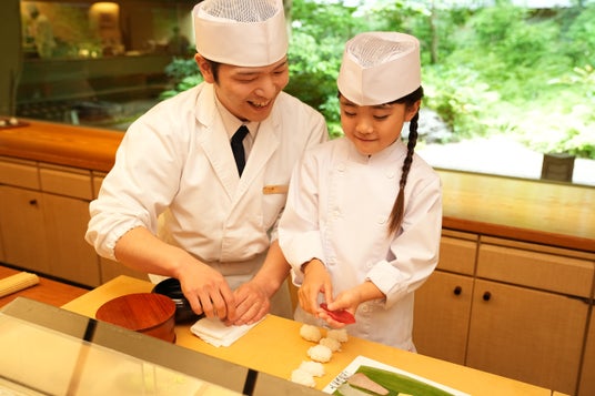 お子さま1名につき職人が1名つくマンツーマンでお教えする寿司作り体験。