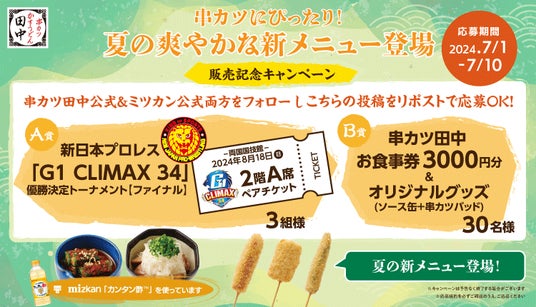 株式会社串カツ田中ホールディングス(本社:東京都品川区東五反田、代表取締役社長:坂本 壽男)が展開する「串カツ田中」は、6月6日(木)から開始している夏の新メニューの販売を記念し、抽選で賞品が当たる「Xフォロー&リポストキャンペーン」を実施します。※夏の新メニューについてはこちらhttps://prtimes.jp/main/html/rd/p/000000451.000027839.html