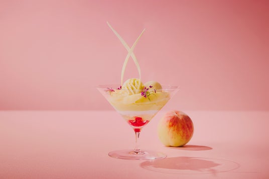 パフェアーティスティックなデザインが目を引く一皿「桃と檸檬とフロマージュのパフェ」。素材そのもののおいしさを頬張った後は、甘さにアクセントをつけるレモンのゼリーや、2種類のクリーム、食感が楽しいグラノーラなどが、桃の果肉と出会って生まれる重層的な味わいをお楽しみください。