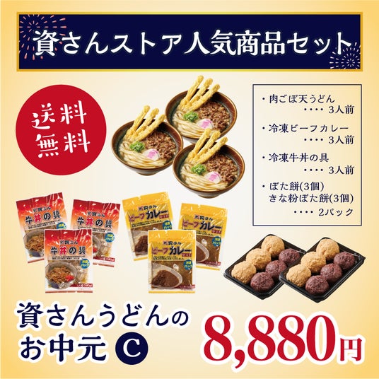 『人気商品セット:8,880円』資さんストアの人気商品をぎゅぎゅっと詰め合わせたおすすめのセット。「肉ごぼ天うどん」、「ぼた餅」に加え、「牛丼の具」、「カレー」をラインナップ。温めるだけでお店の味を再現できる、とご好評をいただいています。「うどん」も「丼」も「ぼた餅」も!「資さんうどん」を再現したかの様な、特別なセットをどうぞ!