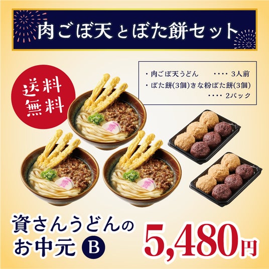 『肉ごぼ天とぼた餅セット:5,480円』「肉ごぼ天うどん」を三人前に、年間540万個以上を売り上げる「資さんうどん」名物、「ぼた餅」をセットにしました。「きな粉ぼた餅」は、通販限定での販売となりますので、いつもお店で「資さん」を召し上がっていただいている方にも、きっと喜んでいただけること、間違いなし。