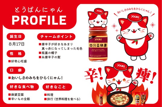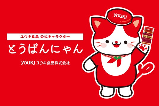 ユウキ食品を代表する商品「四川豆板醤(しせんとうばんじゃん)」をモチーフにしたネコのキャラクター『とうばんにゃん』。創業50周年を記念し、社員にもお客様にも愛されるキャラクターをつくりたいという想いにより、数多くの候補から社員投票で決定しました。