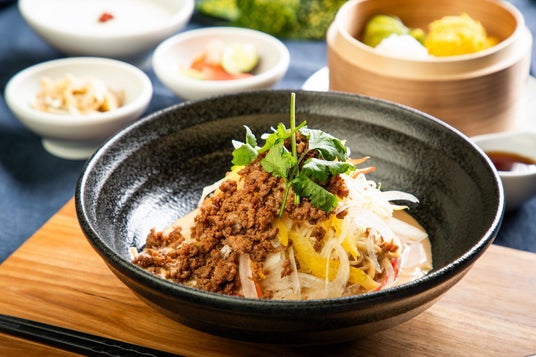冷たくしめた麺に肉味噌と薄くスライスした玉葱、パプリカをたっぷりトッピング。特製胡麻だれをかけてお召し上がりいただきます。甜麺醤で甘辛く仕上げた肉味噌と花山椒が香る特製胡麻だれが麺に絡みあい、後引く美味しさです。「冷やし担々麺」の他、4種類の副菜もご用意しました。夏のスタミナ食として栄養たっぷりな『冷やし担々麺』ランチを是非ご賞味ください。