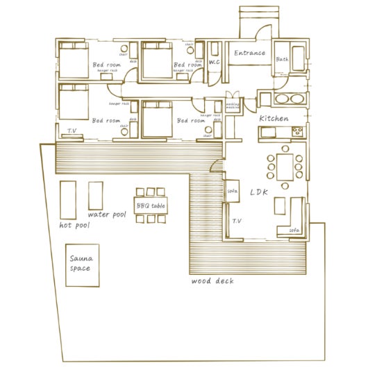 全ての棟には、広々とした専用庭(パティオ)を有し、専用庭には本格サウナを設置しています。コテージの定員はそれぞれ、8名、8名、5名で最大21名宿泊できます。各敷地内には2台まで駐車できる駐車スペースを用意しています。